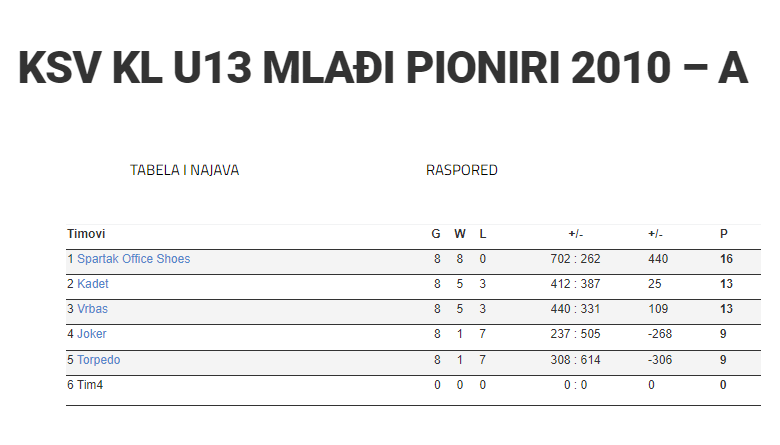 Završena je grupna faza takmičenja vojvođanske kvalitetne lige za igrače U13 – mlađe pionire. KK Kadet je u grupi A zauzeo drugo mesto sa istim brojem poena kao i trećeplasirana ekipa KK Vrbas. U dalji krug takmičenja idu prve četiri ekipe iz grupe A.